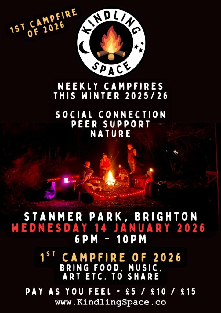 Welcome to Kindling Space. A campfire community in Brighton, launched in 2021 and with new regular meetings throughout the winter of 2025/26.